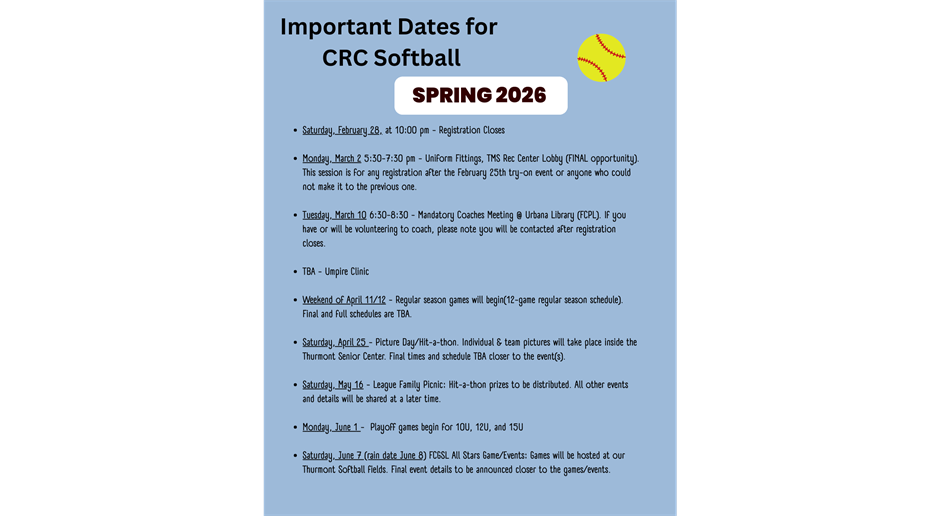 Spring 2026 games will begin across Frederick County for all FCGSL Organizations. Mark your calendars for week 1 of games to begin the weekend of April 11/12.
